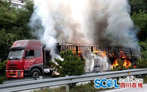 据了解,出事车辆是从山东某公司开往四川遂宁,驾驶员在经过广南高速嘉陵江特大桥时就发现车厢后面不断有烟冒出,过桥后停车检查才发现车厢后面起火了。