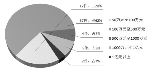 “小官巨贪”案件,是指职务犯罪人员职务、级别不高(本文特指基层科级以下干部),但涉案金额在50万元以上的案件。2012年以来,江苏省镇江市检察机关查办此类案件共60件72人,其中,2012年查办6件7人,2013年查办12件13人,2014年查办13件16人,2015年查办17件23人,2016年上半年已查办12件13人(如图一),呈逐年上升趋势。在所办案件中,涉案金额50万元至100万元有12件,占查办案件总数的20%;涉案金额达100万元至500万元有37件,占查办案件总数的62%;500万元至1000万元有4件,占查办案件总数的7%;1000万元至1亿元有5件,占查办案件总数的8%;1亿元以上有2件,占查办案件总数的3%(如图二)。“小官巨贪”案件频发,不仅危害后果严重,而且群众反映强烈,严重影响了干群关系,亟须引起重视。