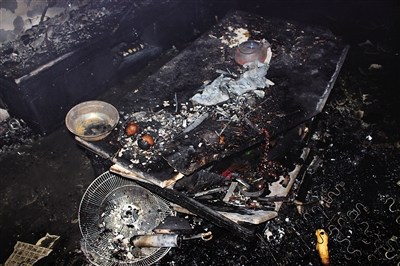 记者发现,烧毁最严重的是一间卧室、客厅、饭厅和厨房,几乎所有的家具家电被毁,天花板可以看到钢筋,另外两间卧室仅床和衣柜没有烧坏。