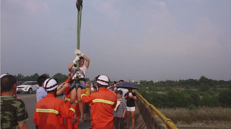 经过查看,救援队员发现在距离桥面约20米高的河滩上,一男两女三名被困人员正焦急的等待救援。先期赶到现场的水务管理人员已经通知上游关小了闸门,同时协调借来了一台民用吊车。见状,消防队员决定采用一点吊的救援方案实施救援。在做好自身安全保护措施的情况下,消防队员紧紧抓住安全绳,带着对讲机随着吊车被徐徐放下,来到了被困人员身边。消防队员先为被困妇女系好安全腰带,交代注意事项,并对其进行了情绪安抚。一切准备工作就绪后,救援队员通过对讲机与桥上指挥人员取得联系,随着一点点起吊,被困妇女安全着陆桥面。随后,消防队员又采用同样的方法救出了另外两名被困人员。