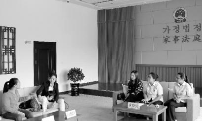 审判庭设在法院刚刚建成的专门审理婚姻家庭案件的家事法庭。这里没有高高的审判桌和原、被告席,取而代之的是三张大沙发,原被告的名牌也变成了“丈夫”、“妻子”。法官开庭不像以往那样让双方出示离婚理由和证据,“你们说说吧,过得挺好的怎么就离婚了?”法官王晶的语气很温和。