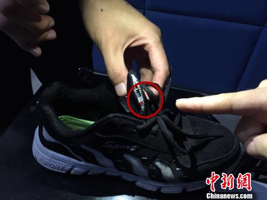 图为特制偷拍鞋,红圈处为摄像头。 警方供图 摄