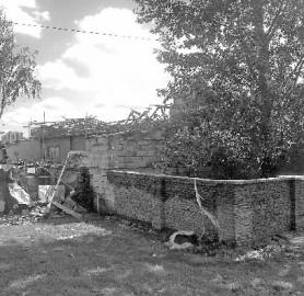 记者看到,该房屋为砖瓦结构,砖墙已经倒塌,木头裸露在外,院内地上都是砖头瓦块,在周围的草坪上破碎的石棉瓦遍地都是。同住该房屋的尹先生描述说:“我家的窗户眼看着就要被鼓开了,我在屋里不敢出去,只能用手顶住窗户,我看见外边也不知道啥东西,大块的小块的都在天上飞。”尹先生说。