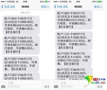 中国青年网北京9月19日电(见习记者 吴阳) 9月17日晚,家住北京市昌平区的赵先生正准备休息,突然收到一条短信:“账户****,于9月17日22:24分转出2000元,余额……,跨行转款。”赵先生心中一惊,自己的银行卡正在往外转钱,而这张银行卡就在自己手上!赵先生随即报警,并拨通了民生银行的客服电话,进行挂失。