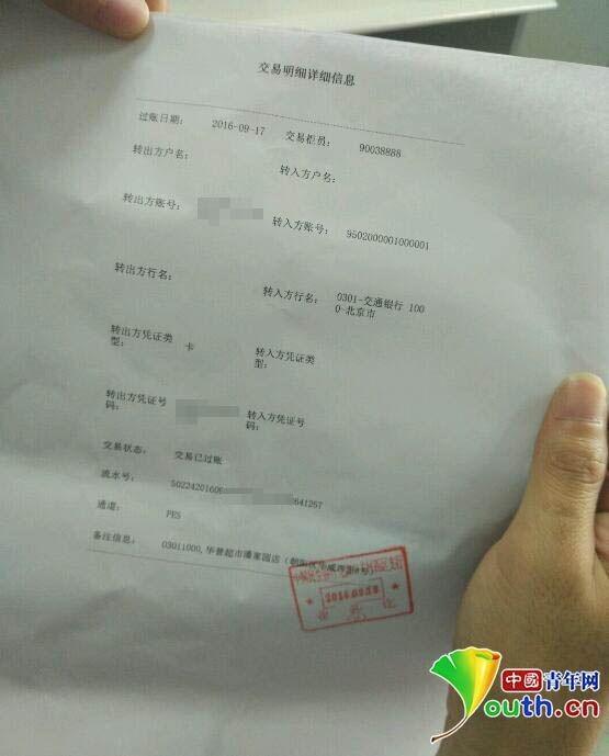 在工作人员的帮助下,赵先生得到了一份《中国民生银行个人账户对账单》和一份《交易明细详细信息》。该《对账单》显示2016年9月17日22:24:36到2016年9月17日22:29:35共转出10笔,每笔2000元的金额,现转标志显示为“转账”,交易渠道显示“银联ATM”,对方行名均显示“交通银行”。中国青年网记者观察这份《对账单》发现,10笔专款中,最短间隔27秒,最长间隔35秒。