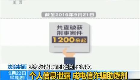 公民个信息泄露,已成为电信诈骗犯罪高发的助燃剂,自今年4月公安部部署开展打击整治网络侵犯公民个人信息犯罪专项行动以来,截至9月21日,共查破刑事案件1200多起,抓获犯罪嫌疑人3300多人,其中银行、教育、电信、快递、证券、电商网站等行业的内部人员270多人,网络黑客90多人,缴获信息290多亿条。