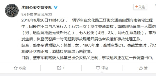沈阳一女司机操作不当撞人致1死7伤 交警:未饮酒