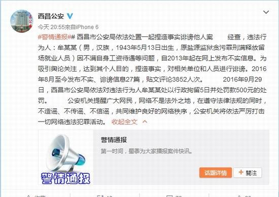 9月29日晚,西昌市公安局官方微博“西昌公安”发布警情通报:违法行为人牟某某(男,汉族,1943年出生,原盐源监狱贪污罪刑满释放留场就业人员)因不满自身工资待遇等问题,自2013年起在网上发布不实信息。为吸引舆论关注,达到其个人目的,捏造事实,对相关单位和人员进行诽谤。2016年8月至今发布不实、诽谤信息27篇,贴文评论3852人次。