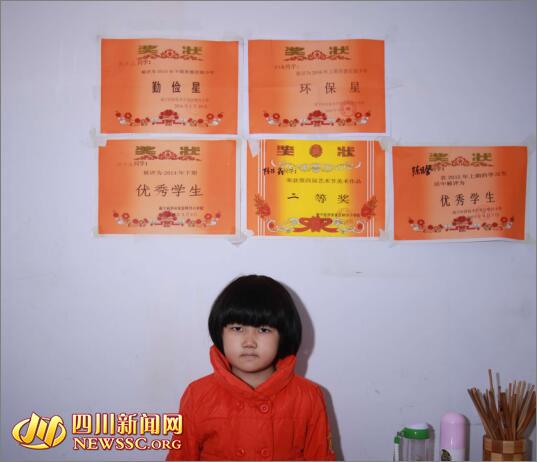 佳佳身体不好,但学习成绩很好,家中墙上贴满自己的奖状。