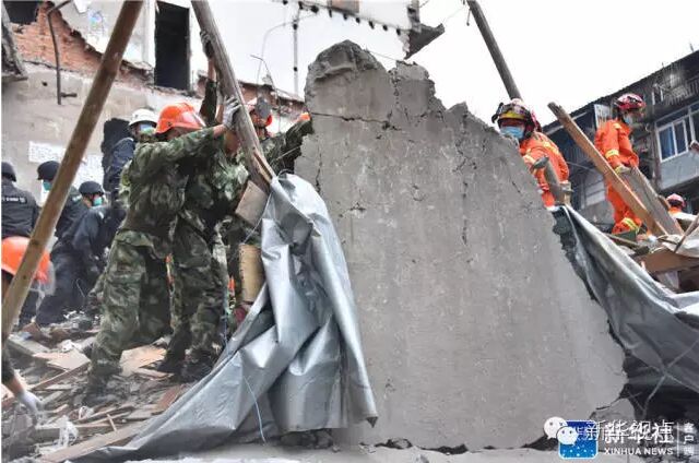 ↑10月10日清晨,救援人员在房屋倒塌事故现场搜救。新华社发