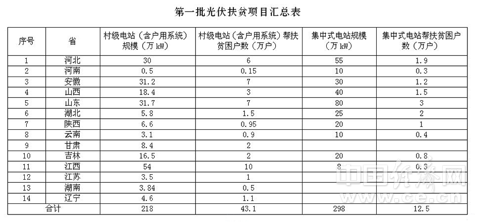我国首批光伏扶贫项目发布:总规模516万千瓦 14省份山东居首(图)