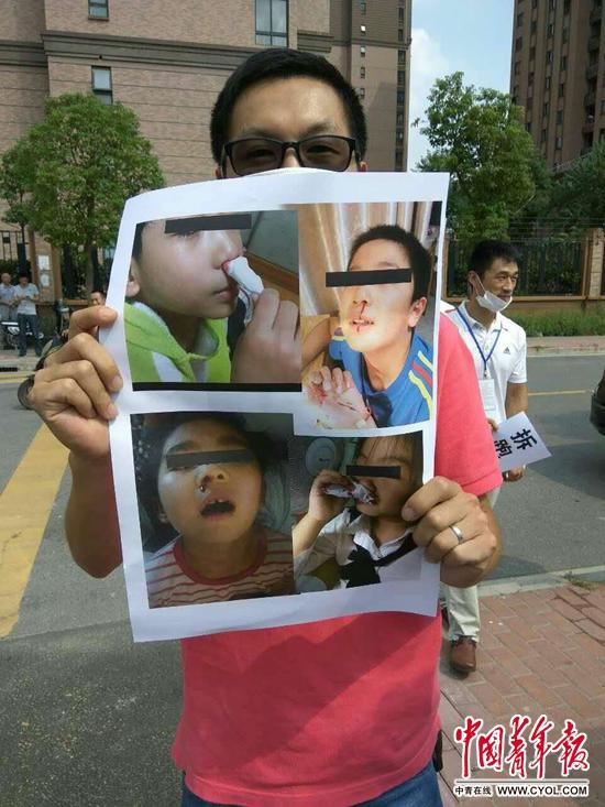 家长在泗泾三小校门外展示孩子流鼻血症状图片。
