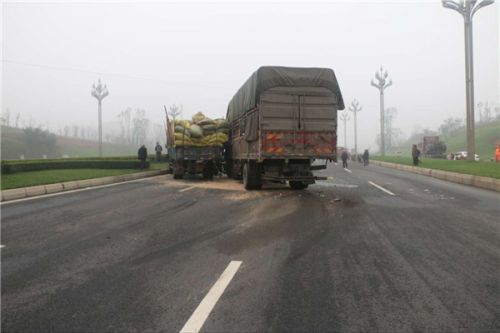 成都两辆大货车追尾致一人被困 天府消防成功救援