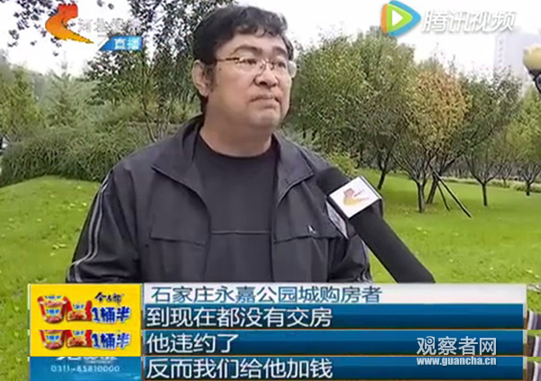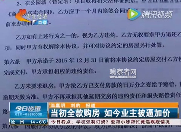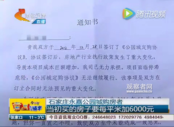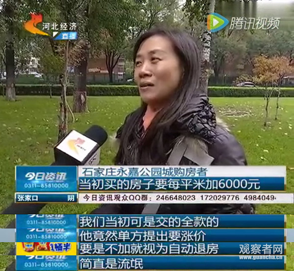 这件事就发生在石家庄。据河北电视台经济频道今日资讯栏目报道,石家庄的“永嘉·公园城”楼盘早在2012年就已开售,开发商向客户承诺于2015年12月31日前交房,到了2016年,开发商不仅未交房,还每平米涨价6000元。据河北电视台采访到的一名购房者出示的合同显示,当时购房价格为7208元/平米。