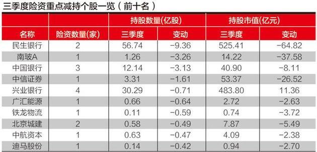和公募基金类似,险资在三季度也大幅减持了部分银行股,减持的前十大重仓股中,有三席来自银行板块,分别是民生银行、中国银行和兴业银行,减持数量分别是9.4亿股、3.1亿股和7054万股。