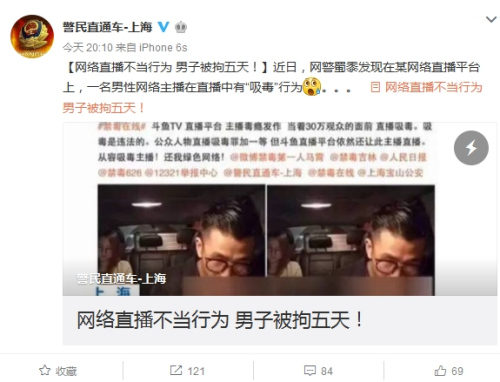 中新网11月6日电据上海公安局官方微博消息,近日,某网络直播平台上,一名男性网络主播在直播中有“吸毒”行为,警方对其进行尿检后证明其不是吸毒人员,但因其在网络直播中连续做出模仿吸毒的动作,带来不良社会影响,违反了《中华人民共和国治安管理处罚法》,扰乱公共秩序,上海公安机关对其处以行政拘留5天。