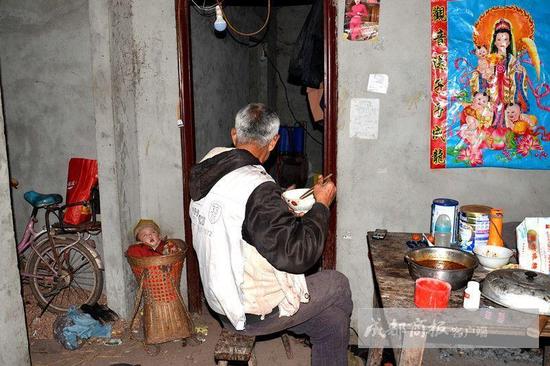 几分钟后,趁女儿还未清醒,胡志飞抱着女儿,很快将一碗稀饭吃下。随后,他叫醒女儿,开始给女儿喂食。此时已过下午两点半,而据胡志飞所说,女儿是上午9点过他回家时吃的早饭。女儿的午饭也是稀饭,只是稀饭中多了几片肥肉。在近一个小时的喂饭中,女儿半躺在他怀中,他边对女儿说“多吃点”,边将稀饭和肥肉塞进女儿口中。而他的女儿仅长了一颗牙齿,一位在场的村民因为担心小女孩被噎着,不时提醒他应将肉剁碎。胡志飞应承着村民的提醒,还说:“她饿了的时候,都是一口就吞下去了。”这让村民很无奈:“你看嘛,他根本带不来娃娃。”