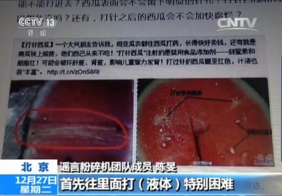 谣言粉碎机团队成员陈旻:就是网络上面出现了一个谣言就是"西瓜打针",往西瓜里面打针,打糖进去然后西瓜变得更甜的那种状态,那个当时我们做了一个实验,首先,往里面打特别困难,西瓜里面本身压力就很高,你想往里面推液体实际上是非常难的,推进去液体之后实际上扩散性非常差,当时我们是拿蓝墨水打的,打进去之后可能,这么大一个瓜只有这么小的一块蓝色墨水,再一个就是打了针之后,有了针眼之后西瓜的腐败会加快。