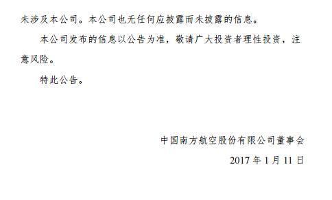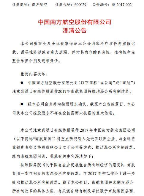 南方航空1月11日在联交所发布澄清公告,公司注意到近日有媒体报道称2017年中国南方航空集团公司将重点研究引入先进互联网企业、与全球行业领先者交叉持股或联合设立子公司等方式,推动混合所有制改革。