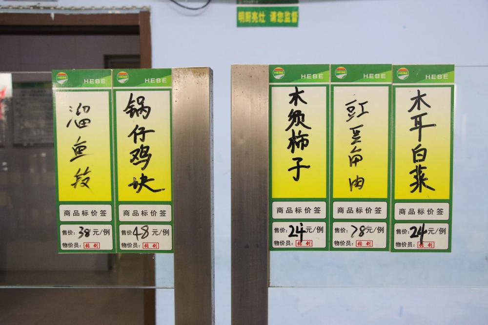 这是河北境内一高速服务区的菜价标牌,一份豇豆角肉售价28元,木耳白菜24元,木须柿子24元,溜鱼段38元,锅仔鸡块48元,一条鱼69元。