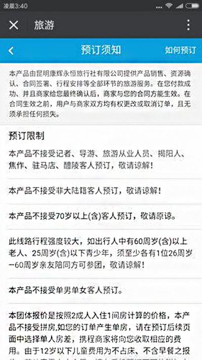 携程网云南游项目限制记者报名,河南等多地人也被限。
