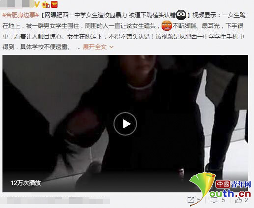 1月18日,有网友通过微博爆料“网曝肥西一中学女生遭校园暴力被逼下跪磕头”,女生在胁迫下数次磕头。微博称该视频是从肥西一中学学生手机中得到,具体学校不便透露,希望当地网警核实消息,并在网络上传一份长达2分15秒的视频。