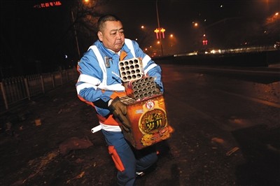 从除夕夜23点到大年初一早上6点,申军健和他的同事们共清理超过3吨重量的爆竹皮,在南三环上来回行驶了2趟。